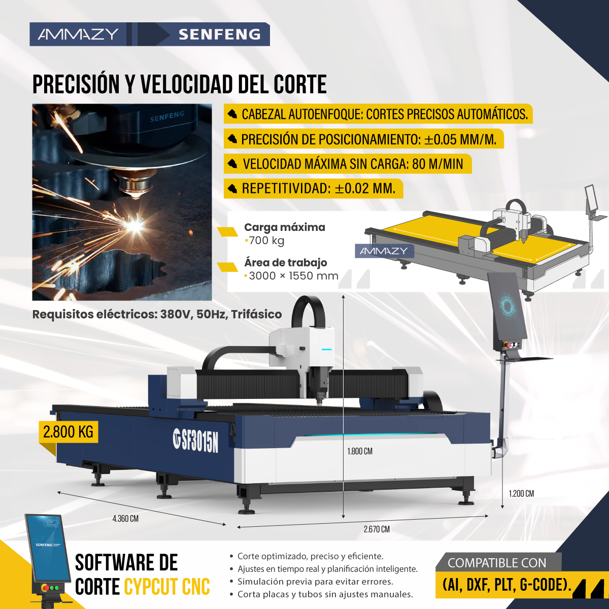 La Senfeng 3015N es una máquina láser de fibra óptica profesional, diseñada para corte y grabado de chapa metálica con máxima velocidad, precisión y confiabilidad industrial.